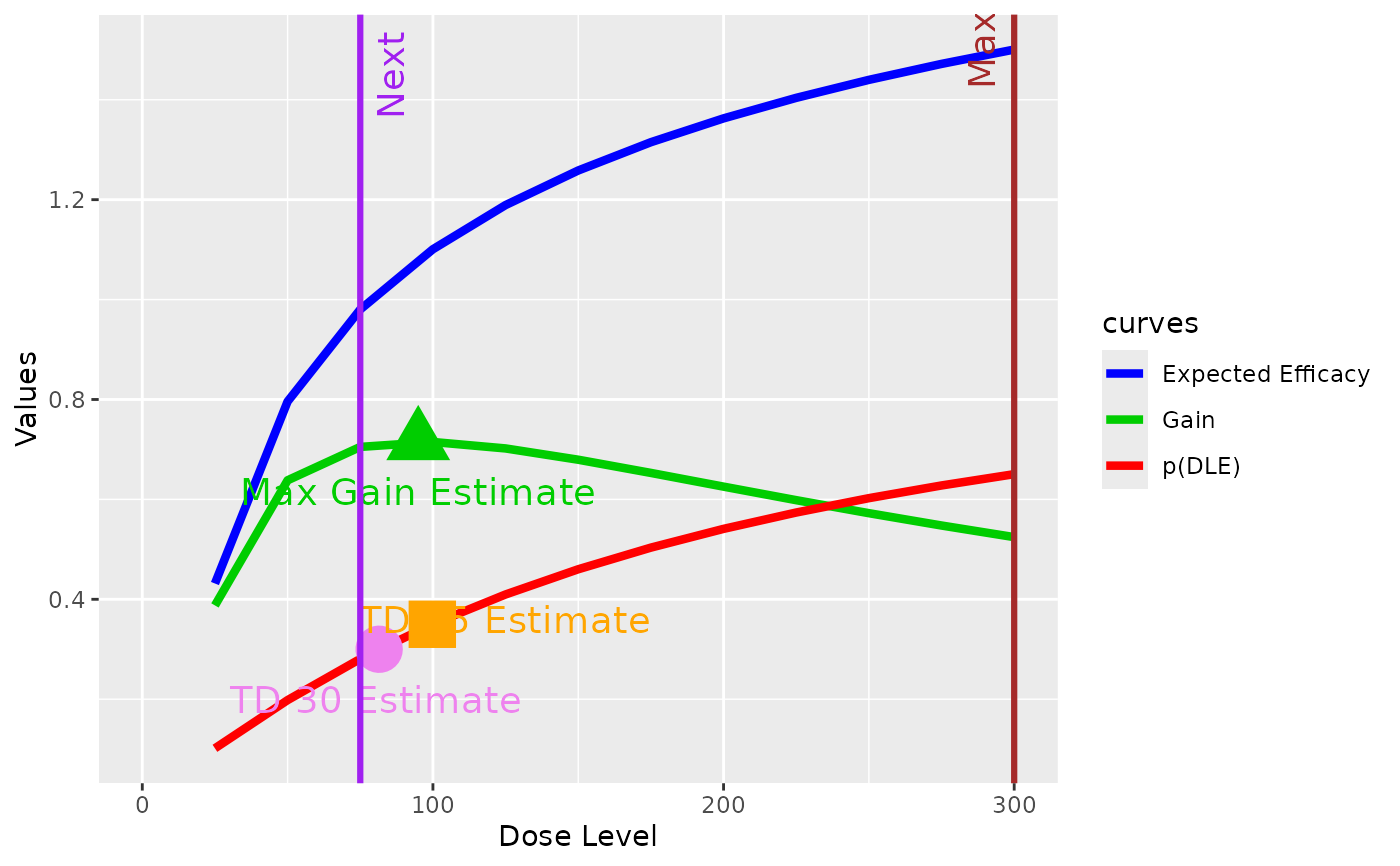 #> [1] "Estimated max gain dose = 300 not within dose grid"