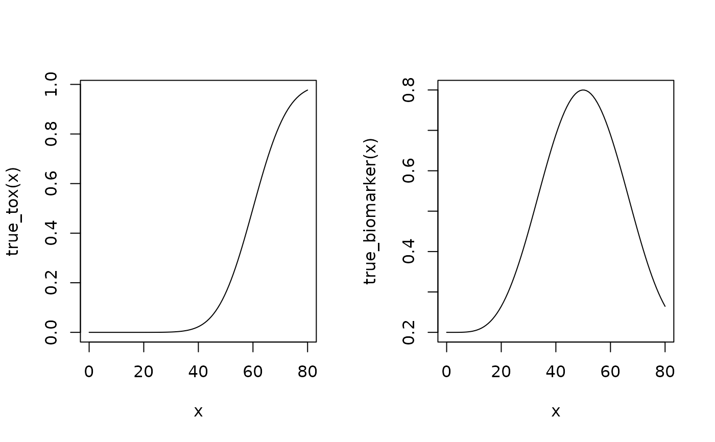 a function which takes as input a dose (vector) and returns the true probability (vector) for toxicity.- trueBiomarker